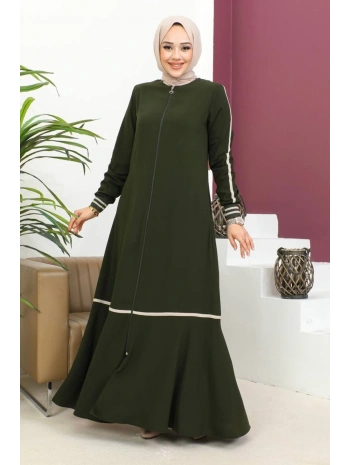 Ribanalı Bilek Şerit Detaylı Tesettür Ferace - Haki / F0122