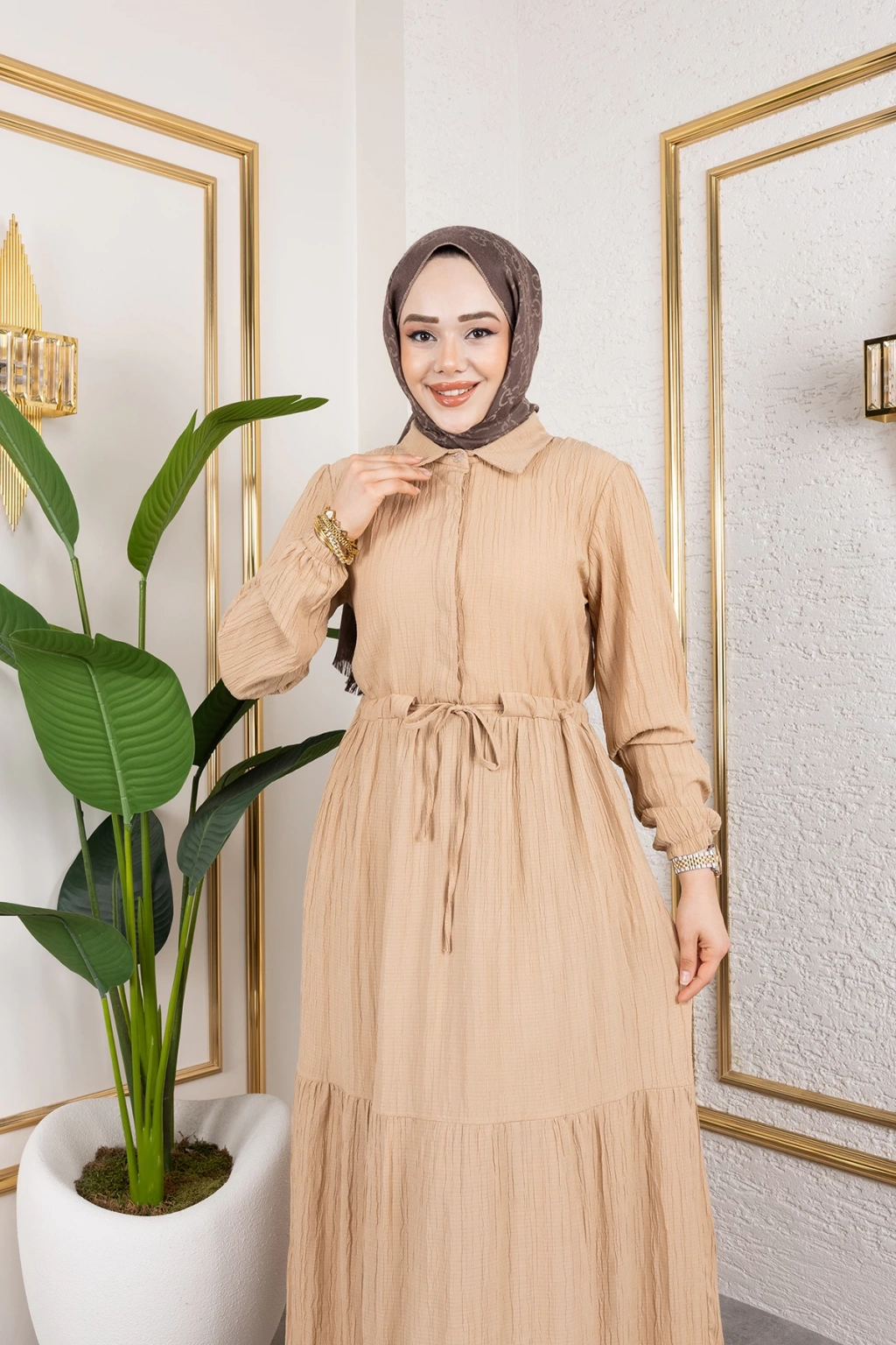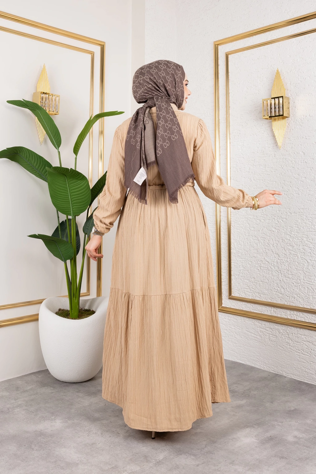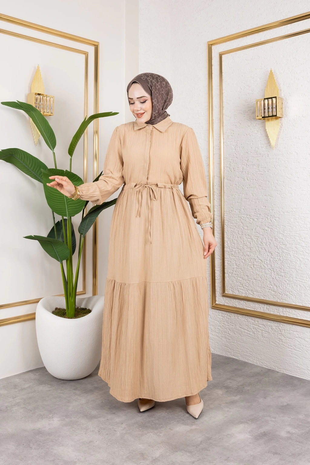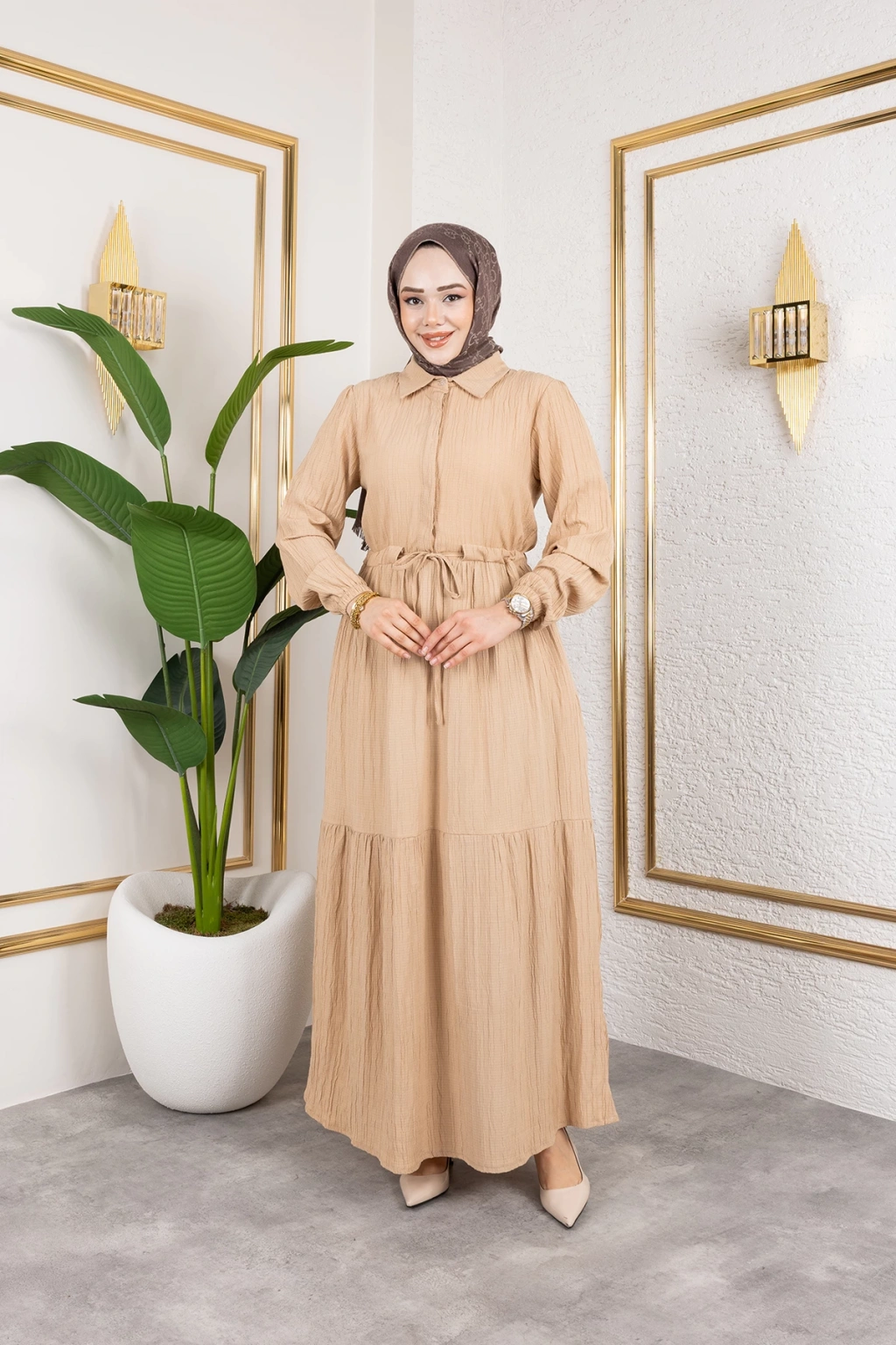 Lara Kumaş Yarım Düğmeli Kadın Elbise - Bej / E0121