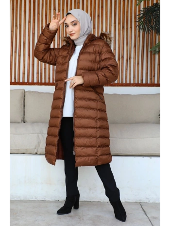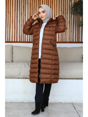 Siyah Kapüşonlu Fermuarlı Şişme Mont - TABA