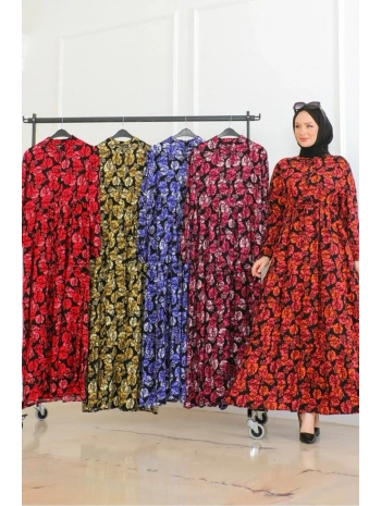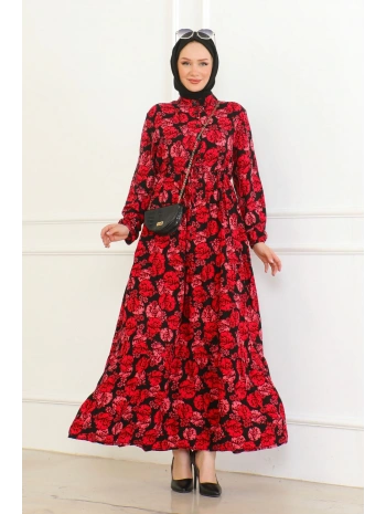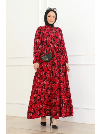 Çiçek Desenli Bağlamalı Viskon Elbise - Kırmızı