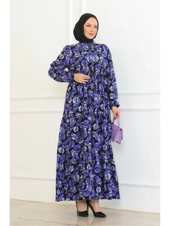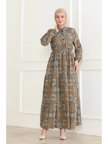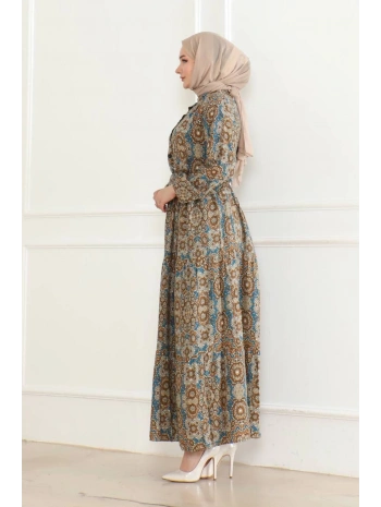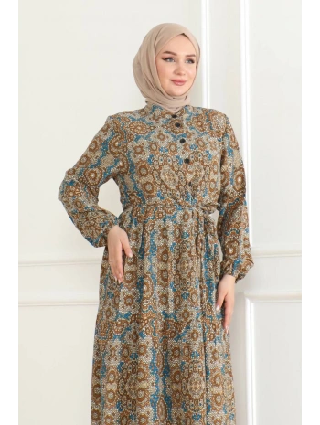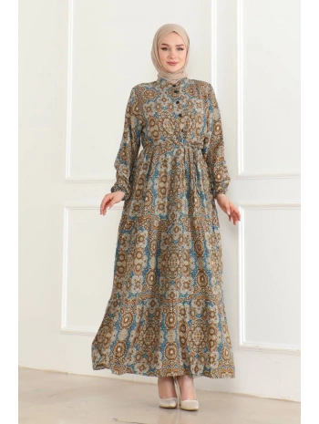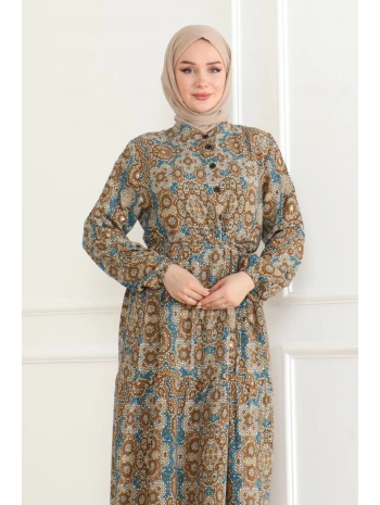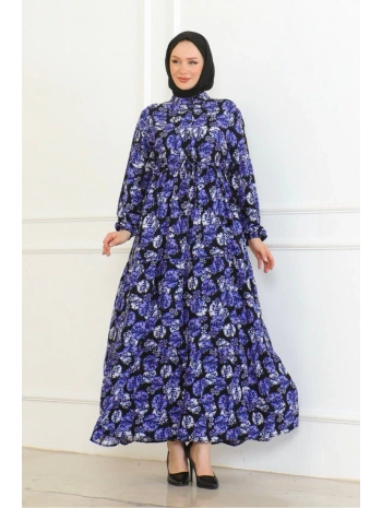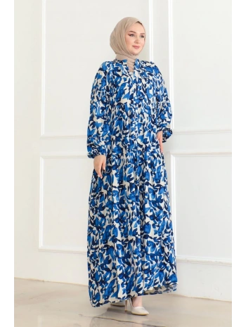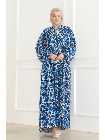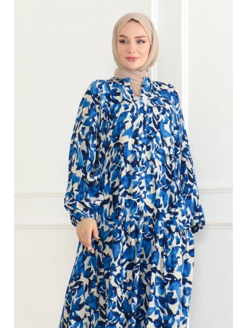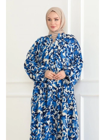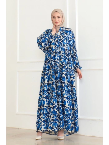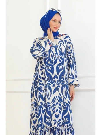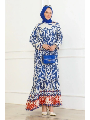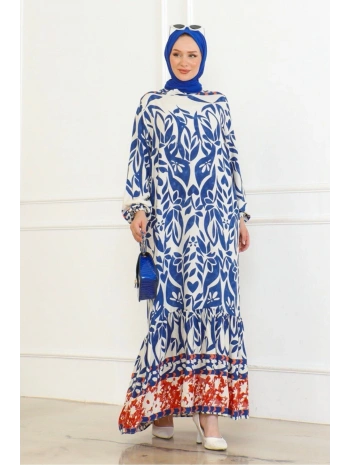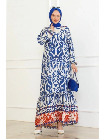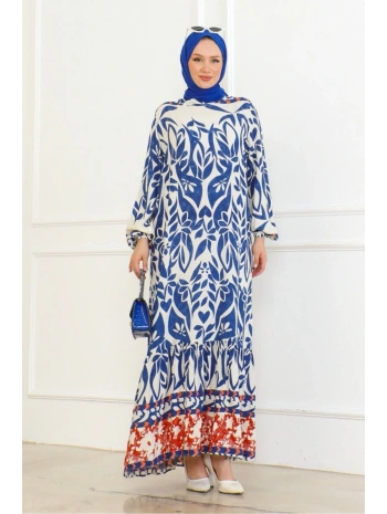 Desenli Etek Uçları Renkli Viskon Elbise - Mavi