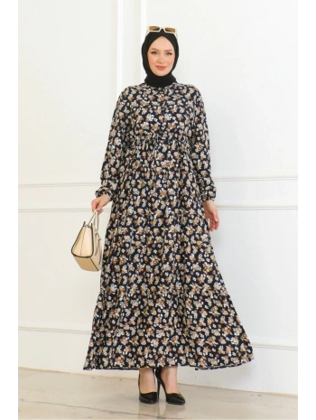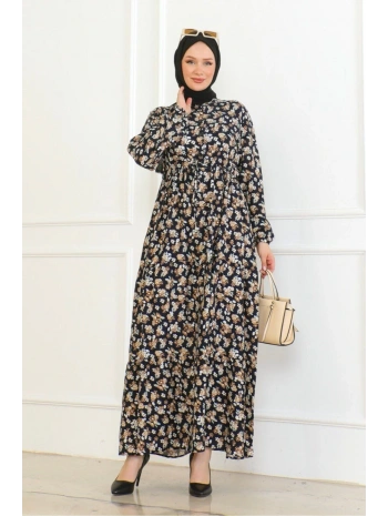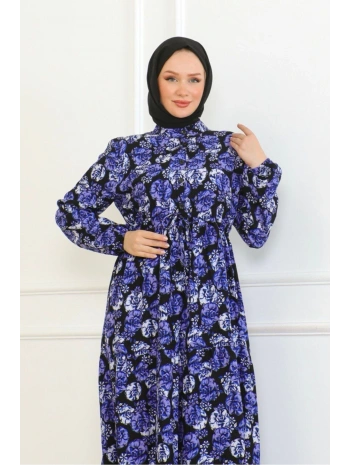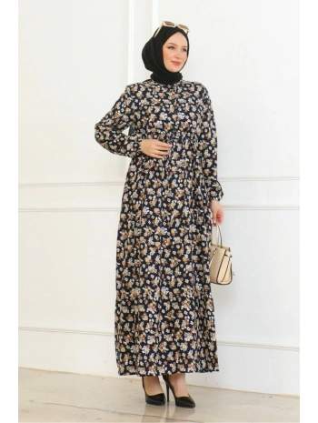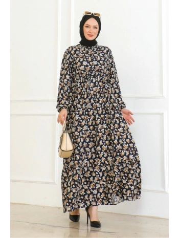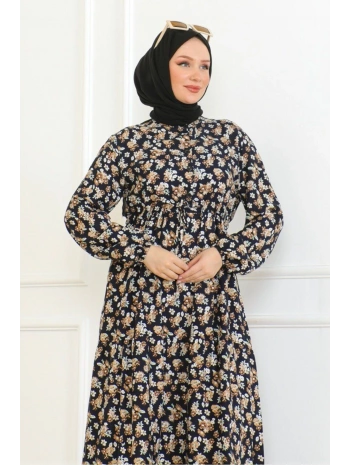 Çiçek Desenli Bağlamalı Viskon Kumaş Elbise - Lacivert