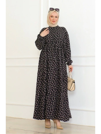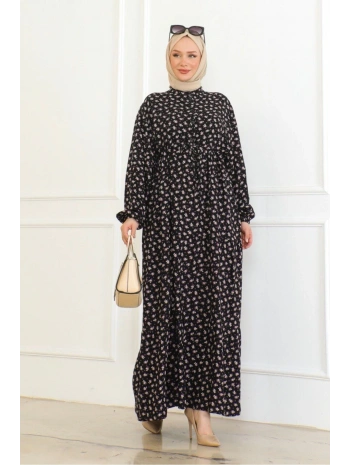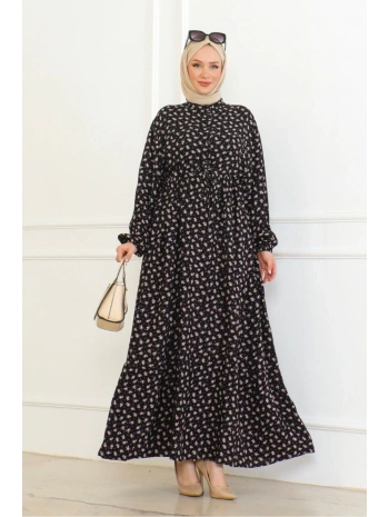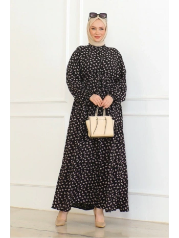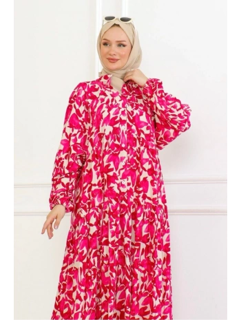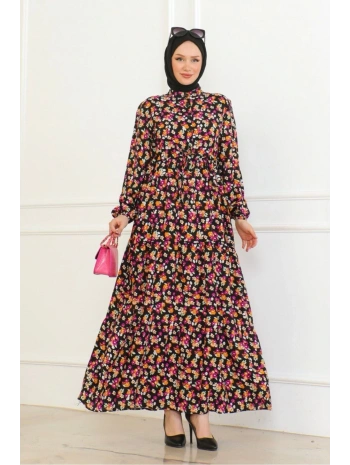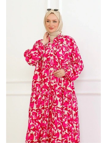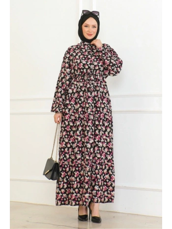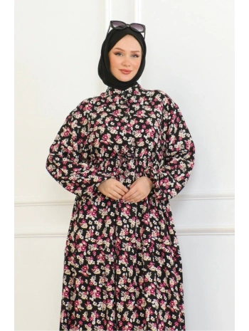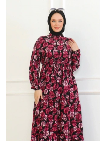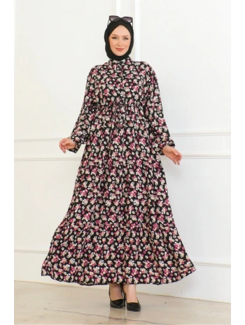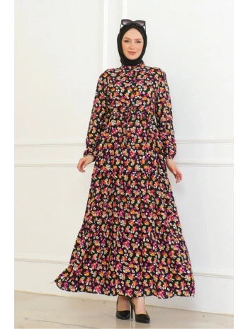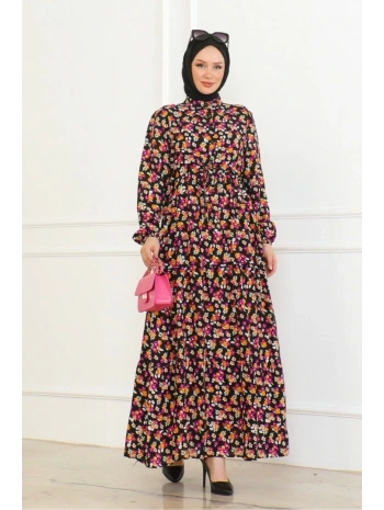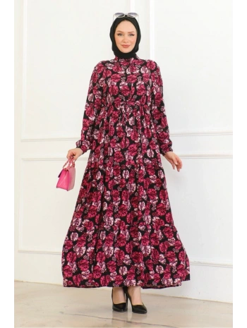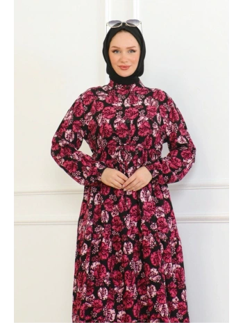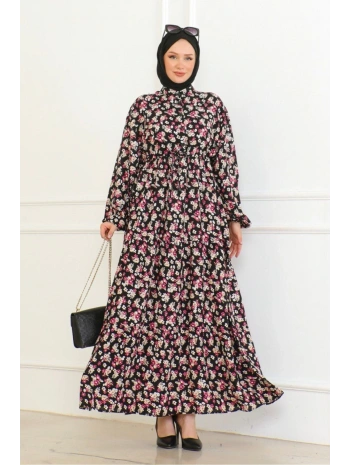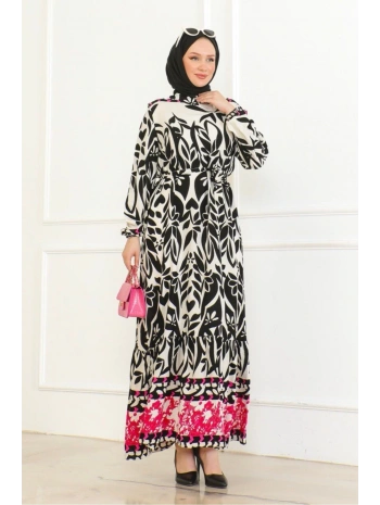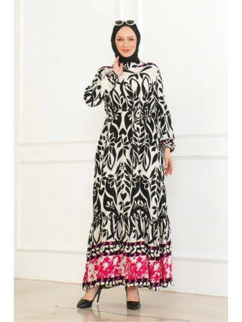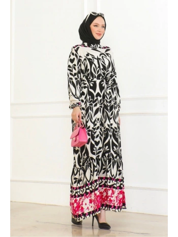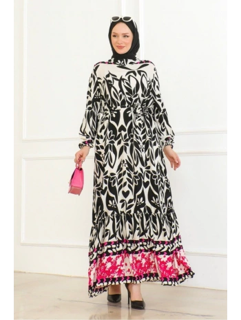 Desenli Etek Uçları Renkli Viskon Elbise - Siyah/Pembe