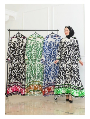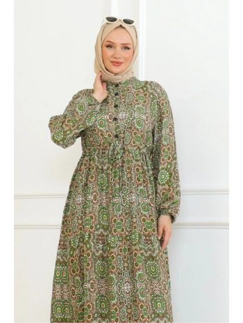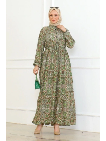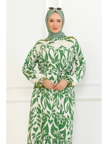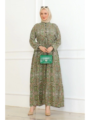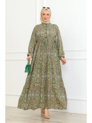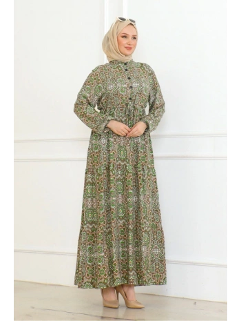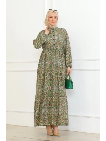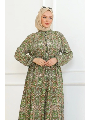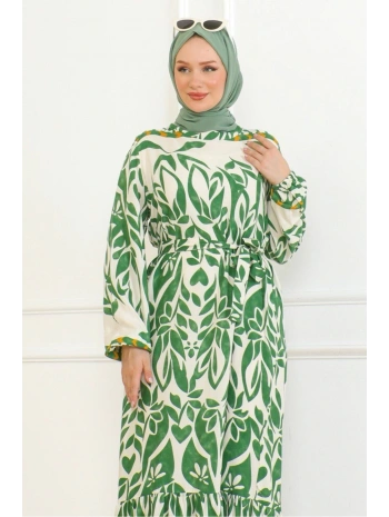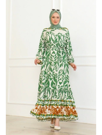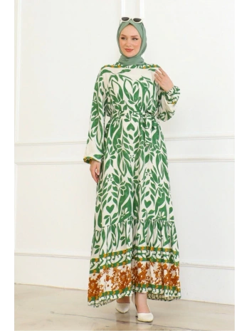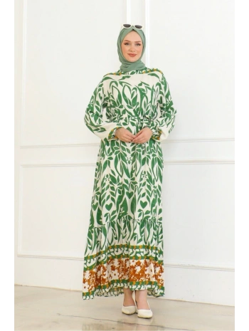 Desenli Etek Uçları Renkli Viskon Elbise - Yeşil
