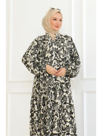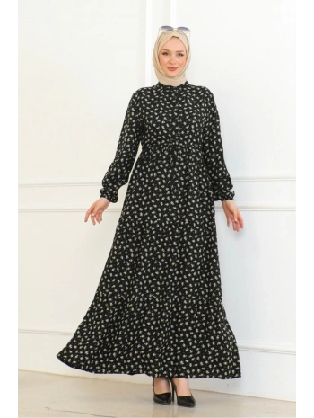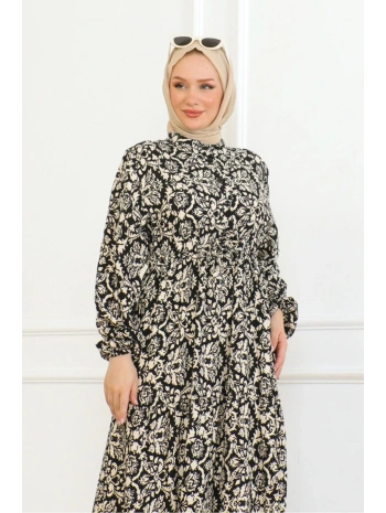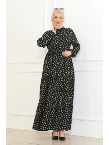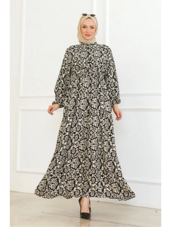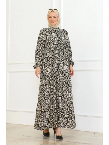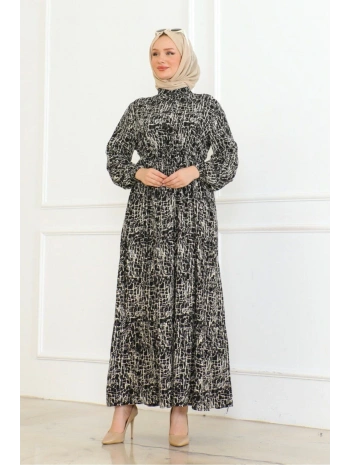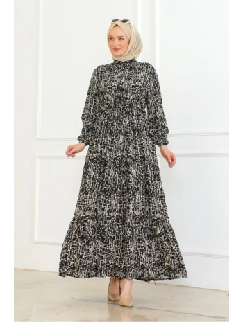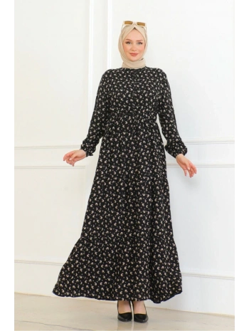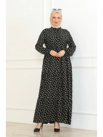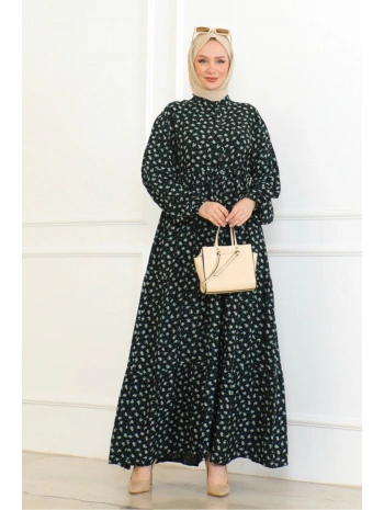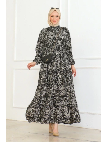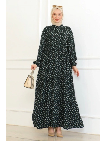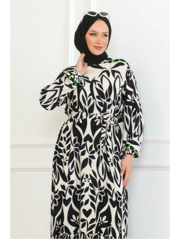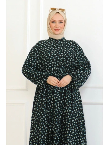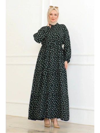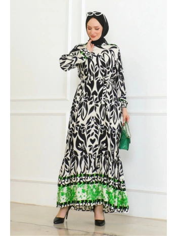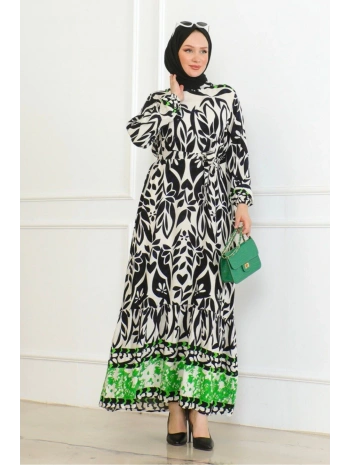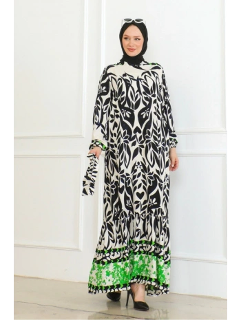 Desenli Etek Uçları Renkli Viskon Elbise - Siyah/Yeşil
