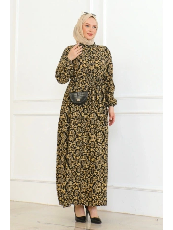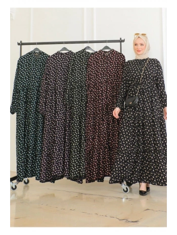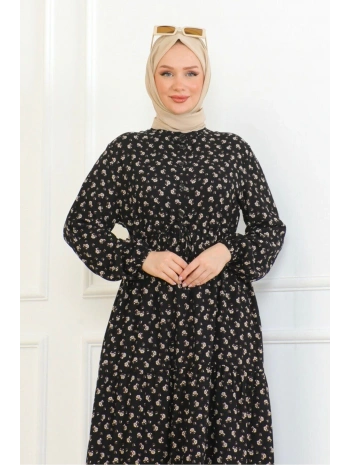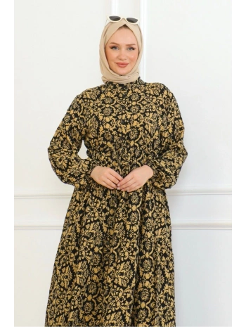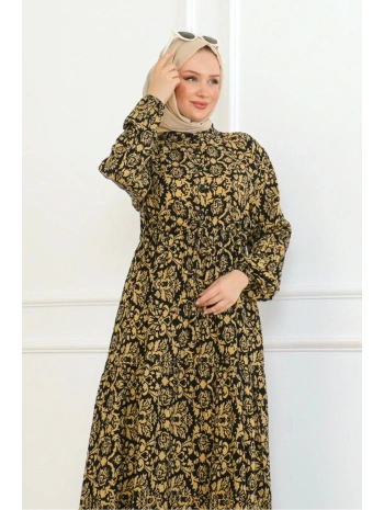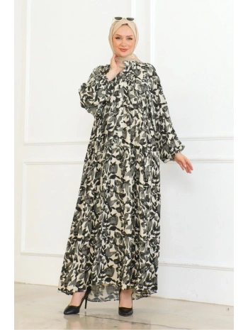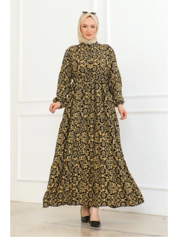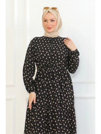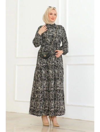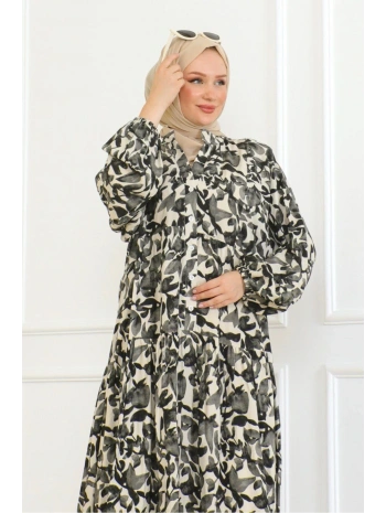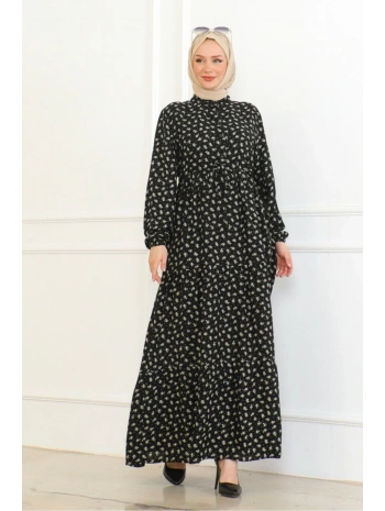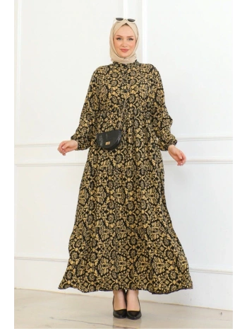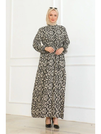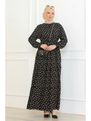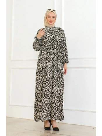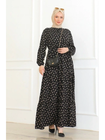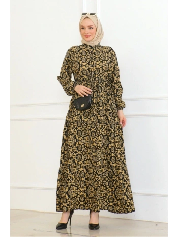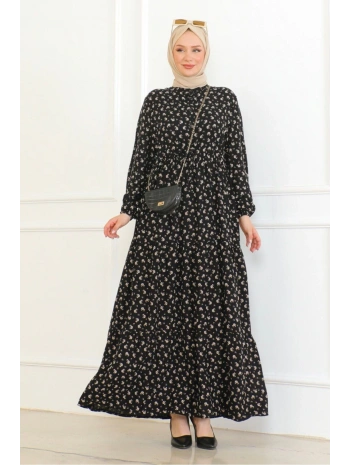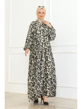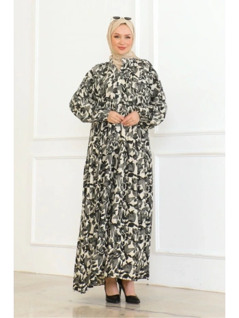 Desenli Etek Uçları Renkli Viskon Elbise - Siyah/Yeşil