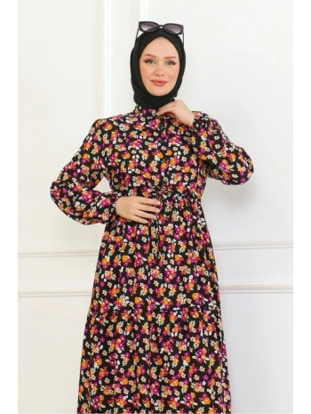 Çiçek Desenli Bağlamalı Viskon Kumaş Elbise - Turuncu/Pembe çiçekler