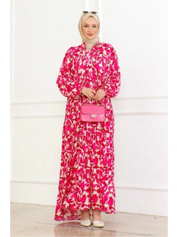 Çiçek Desenli Bağlamalı Viskon Kumaş Elbise - Gül Kurusu