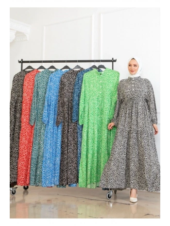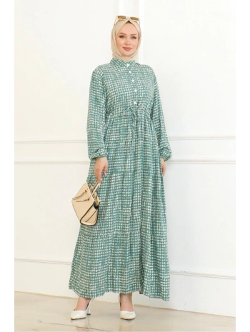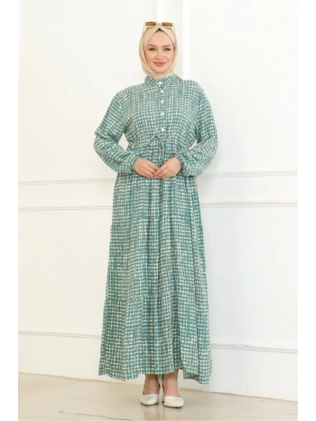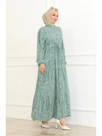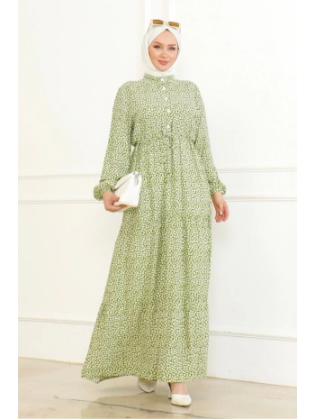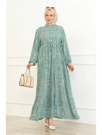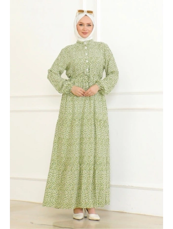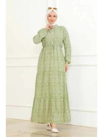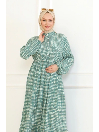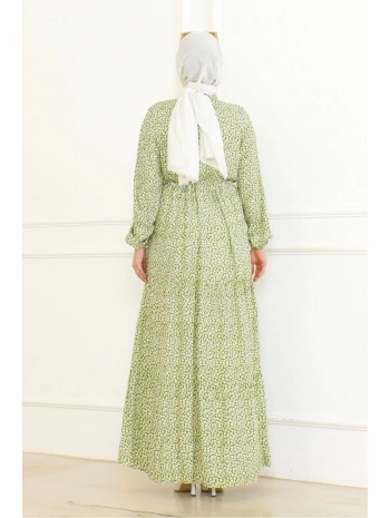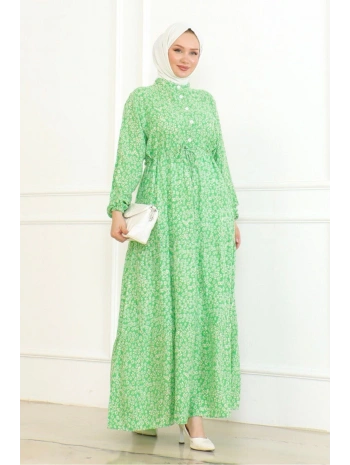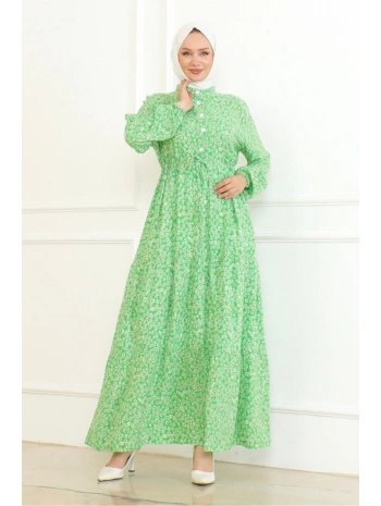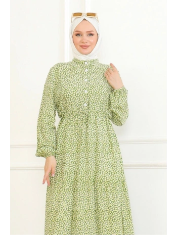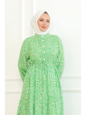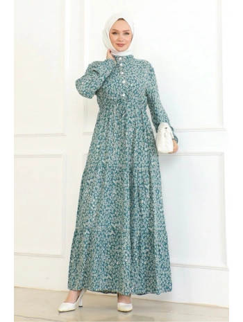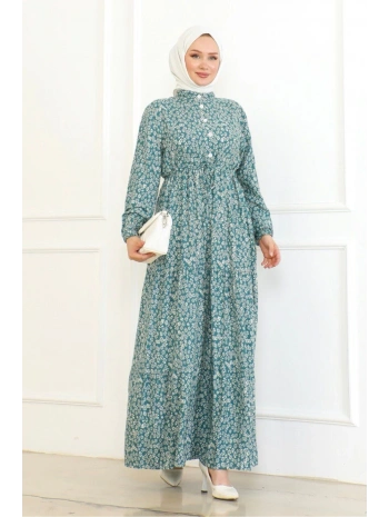 Papatya Desenli Viskon Elbise - Su Yeşili
