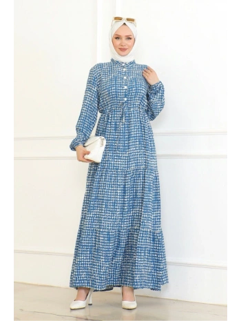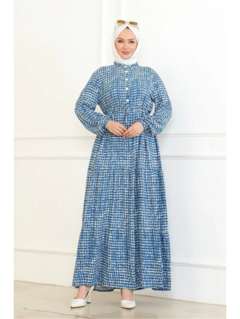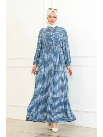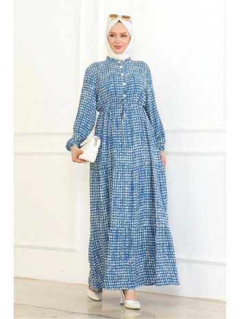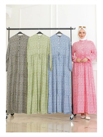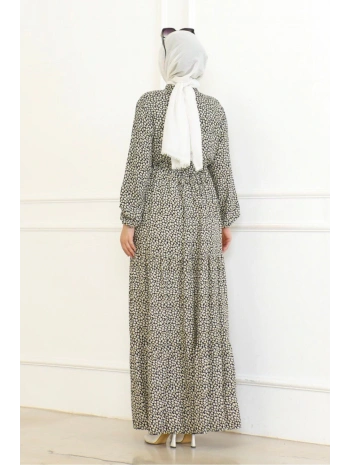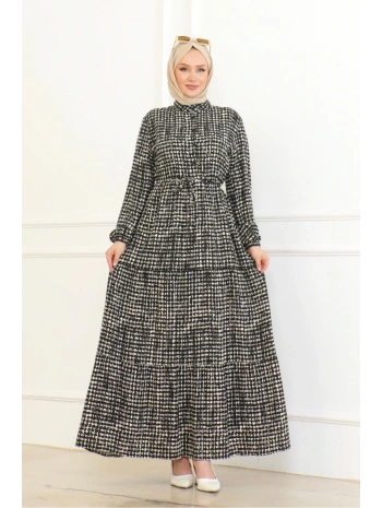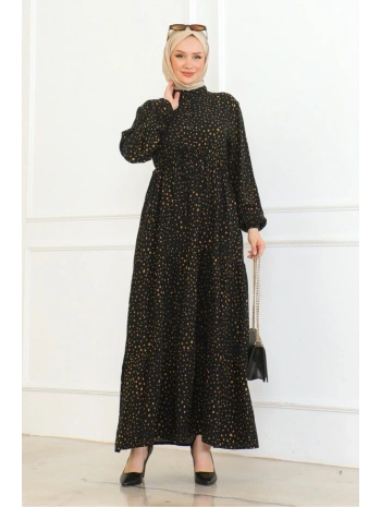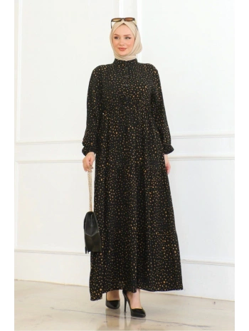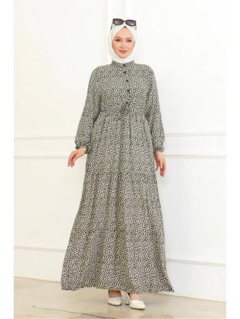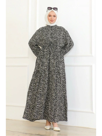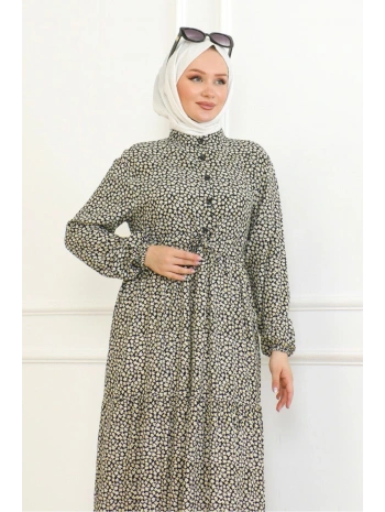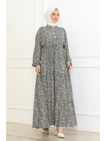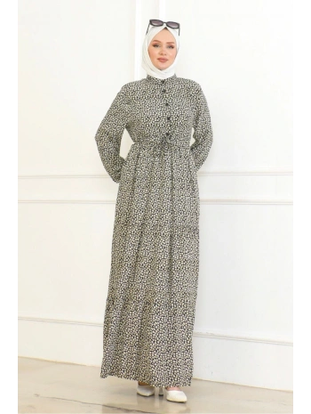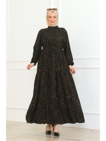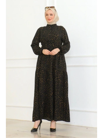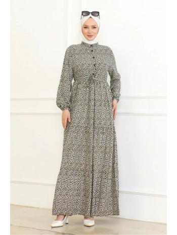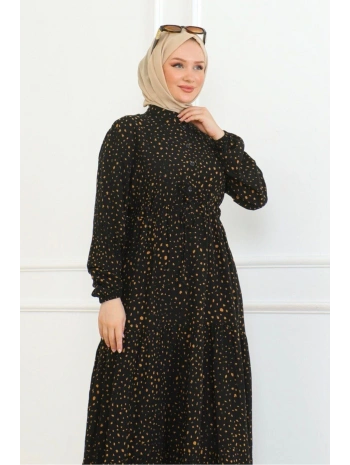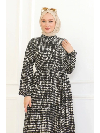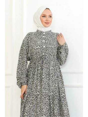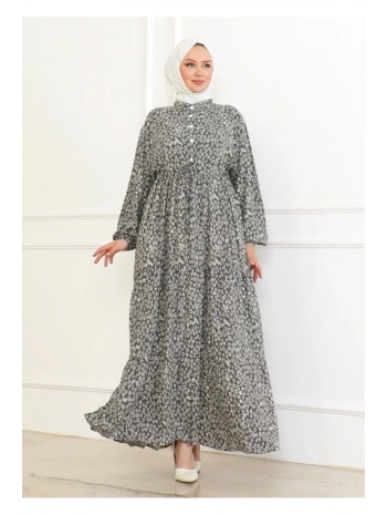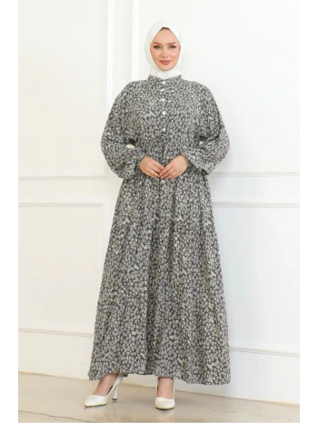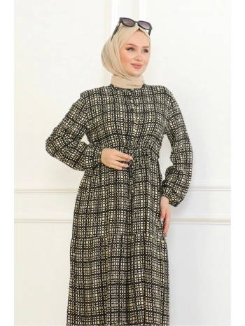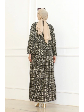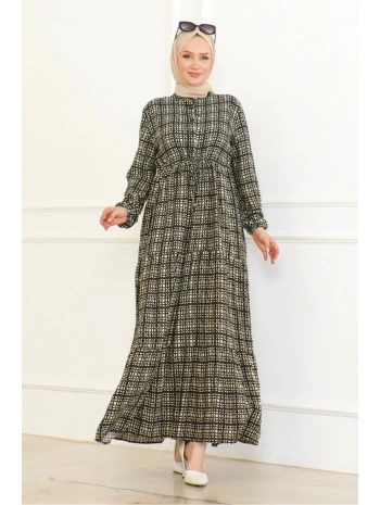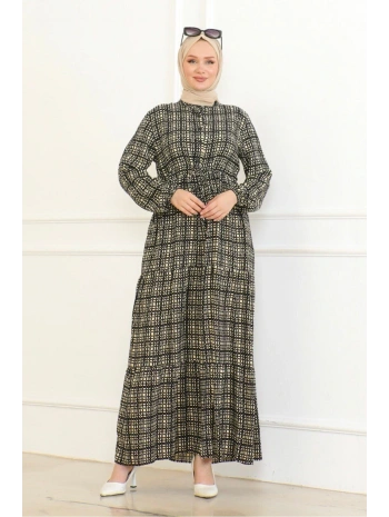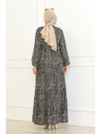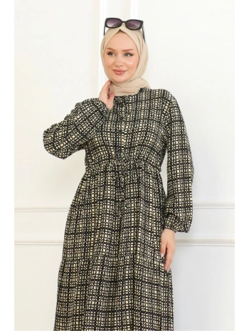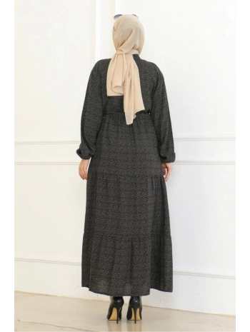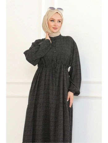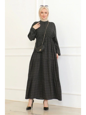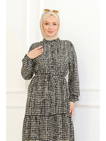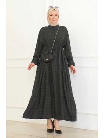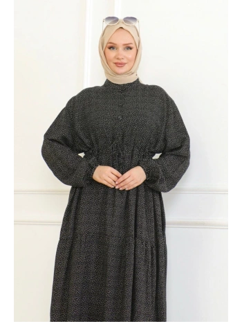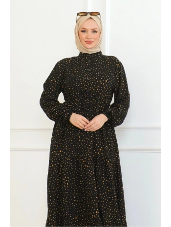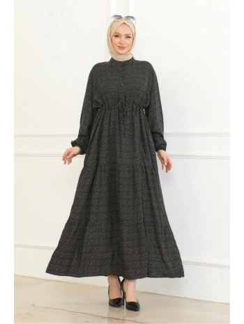 Düğme Detaylı Desenli Viskon Elbise - Siyah