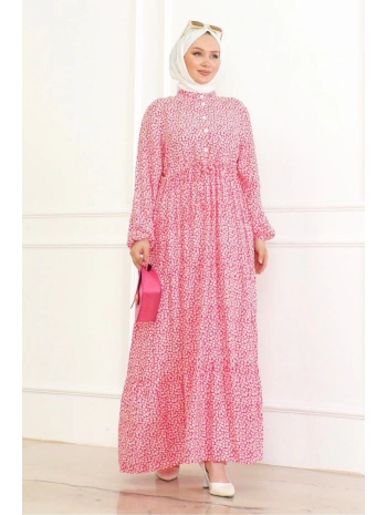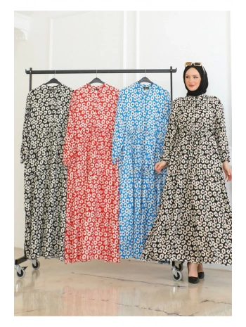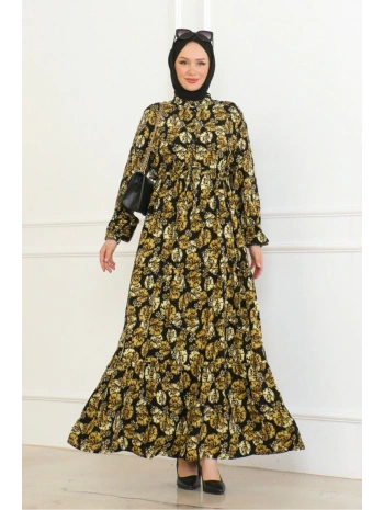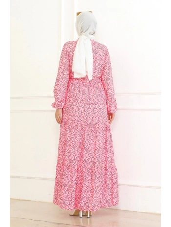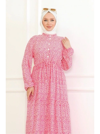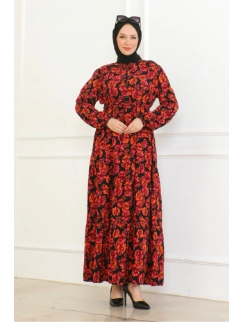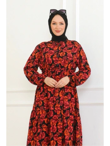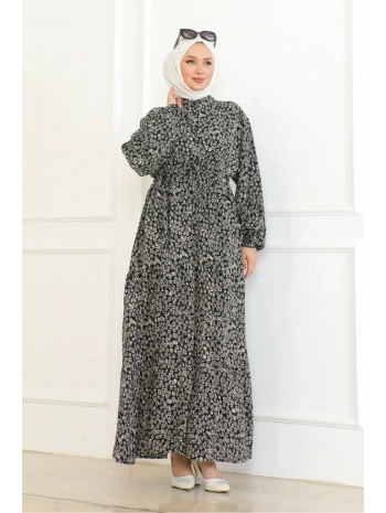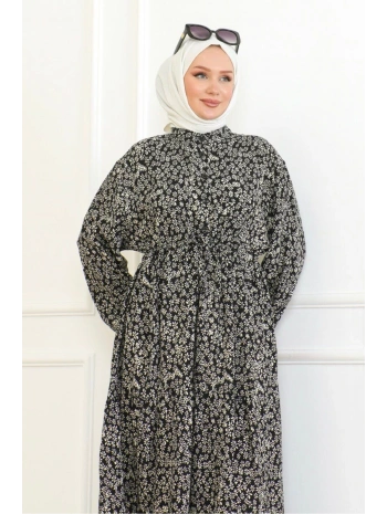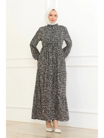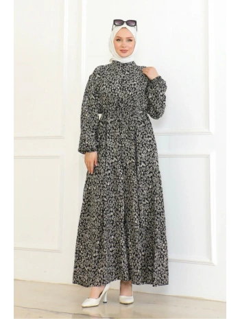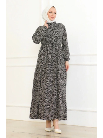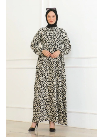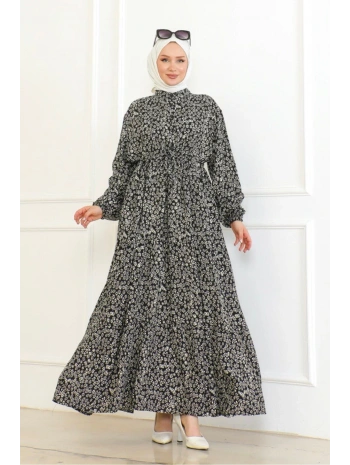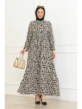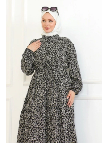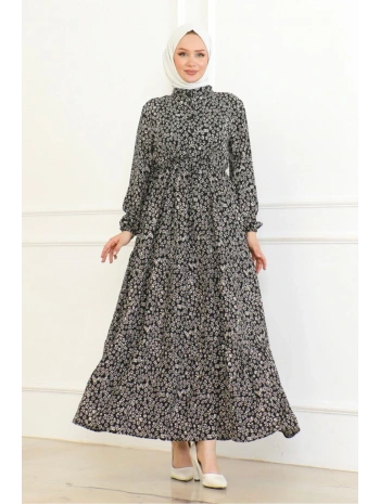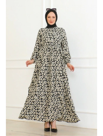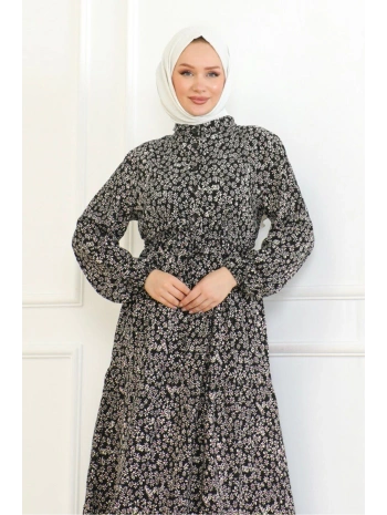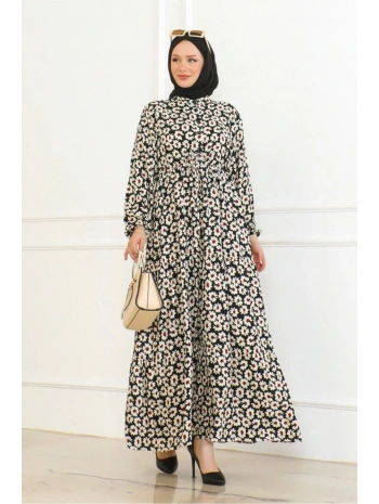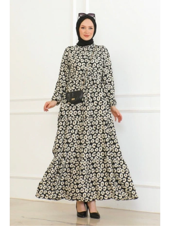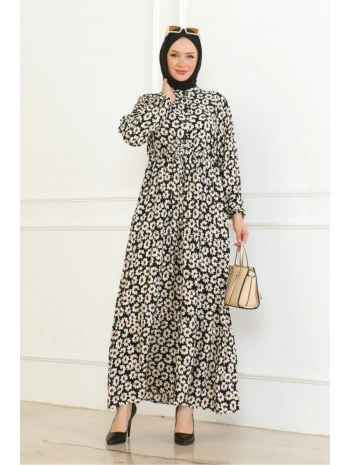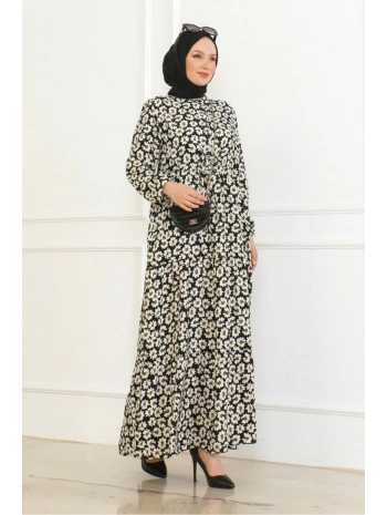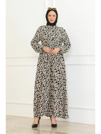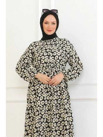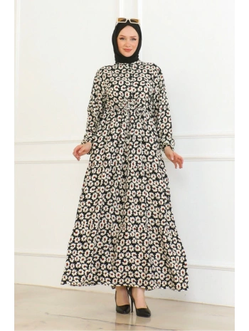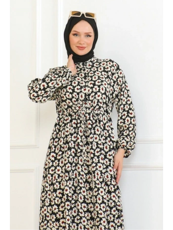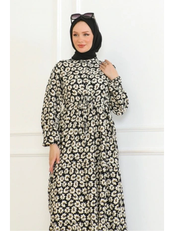 Papatya Desenli Viskon Elbise - Siyah/Pembe detaylı