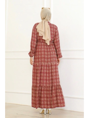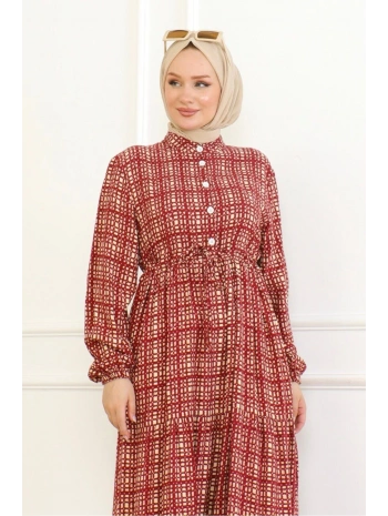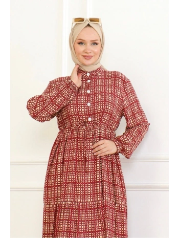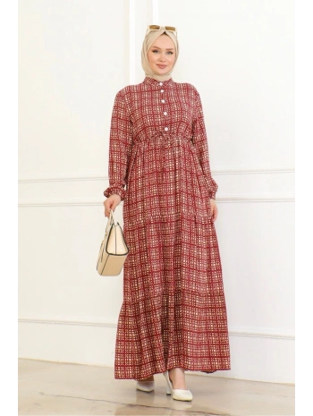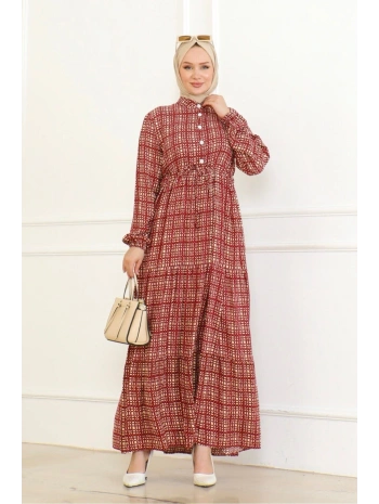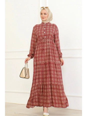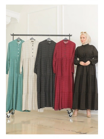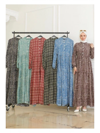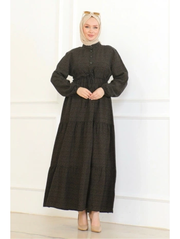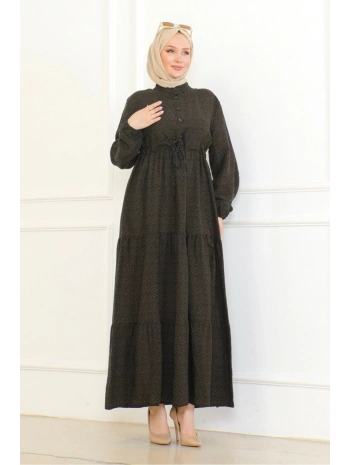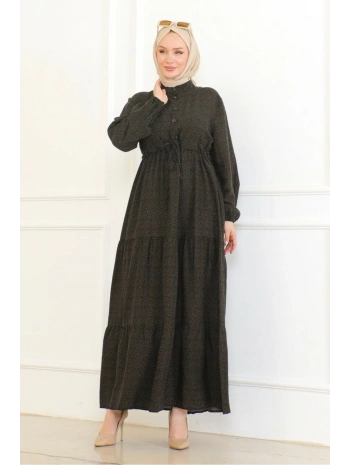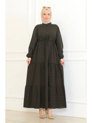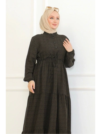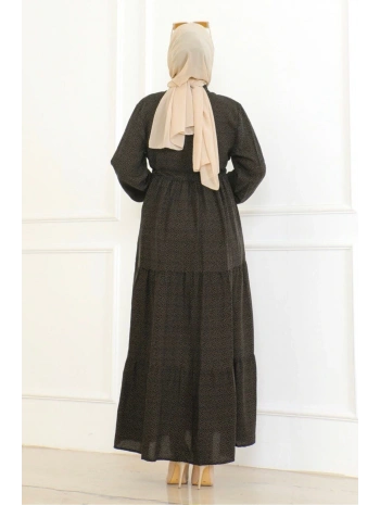 Düğme Detaylı Desenli Viskon Elbise - Siyah/Kahve