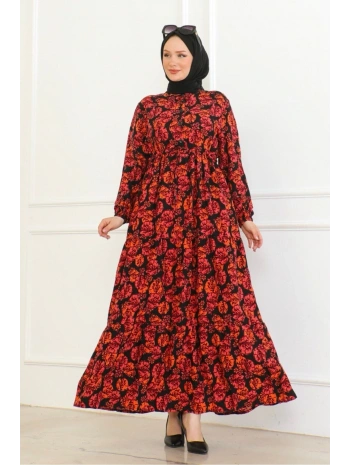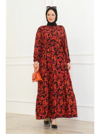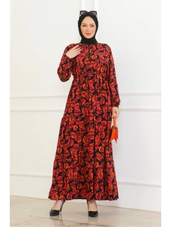 Çiçek Desenli Bağlamalı Viskon Elbise - Turuncu