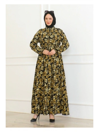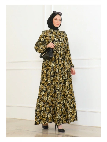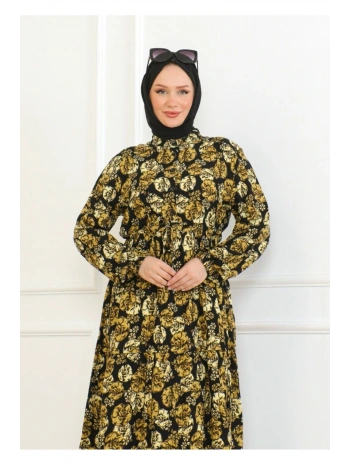 Çiçek Desenli Önü Bağlamalı Elbise / Siyah-sarı