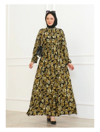 Çiçek Desenli Bağlamalı Viskon Elbise - Sarı