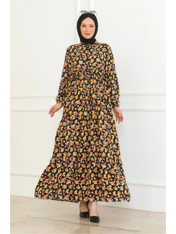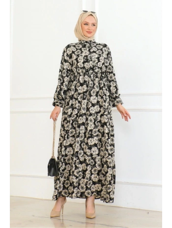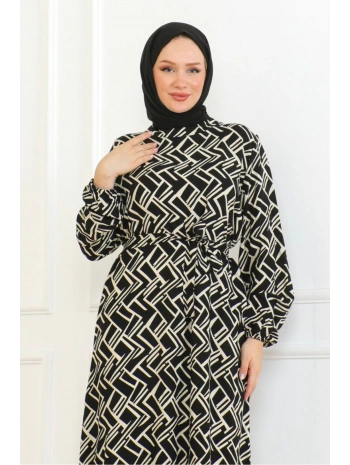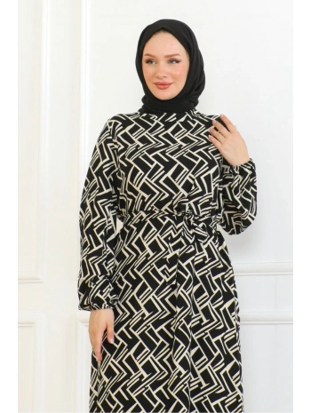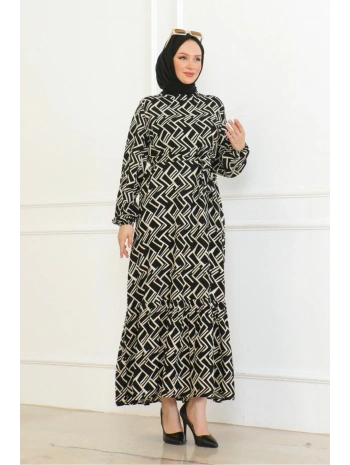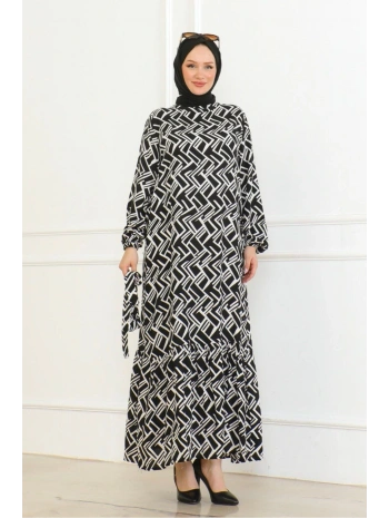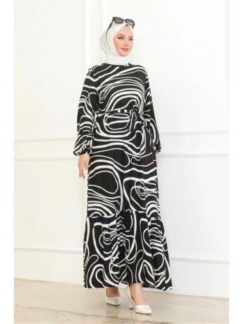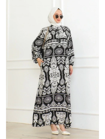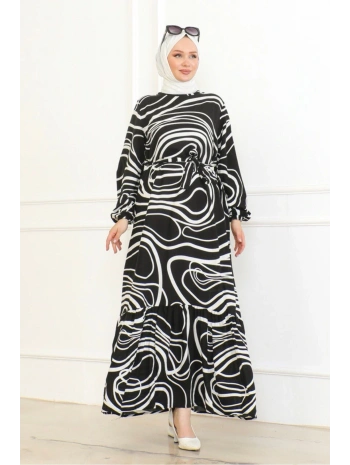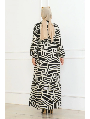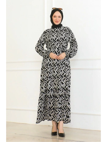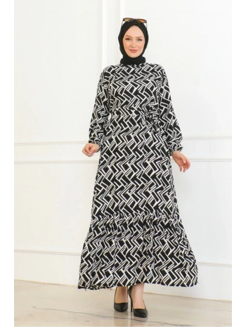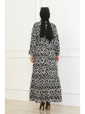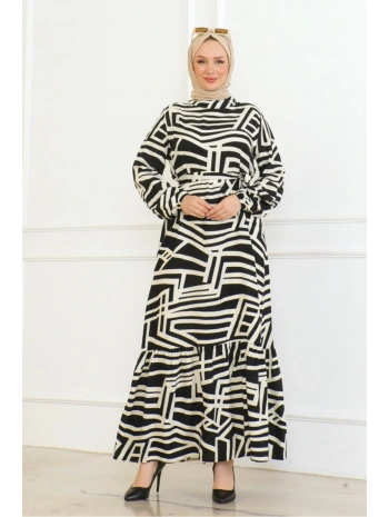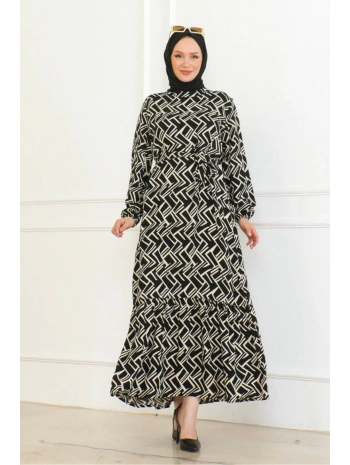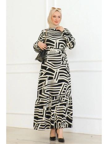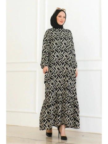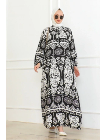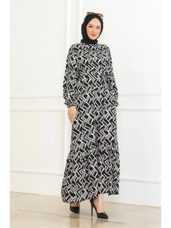 Desenli Viskon Elbise - Siyah
