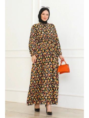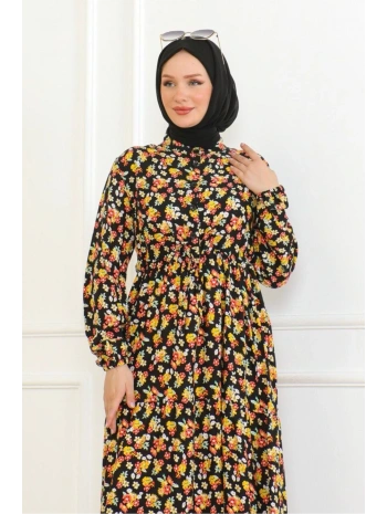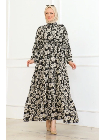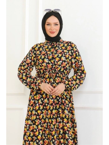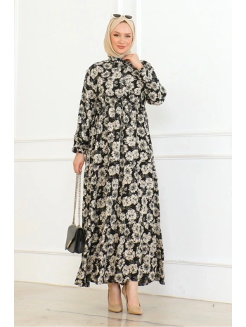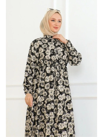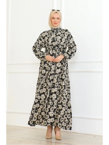 Düğme Detaylı Çiçekli Viskon Elbise - Siyah