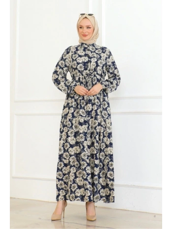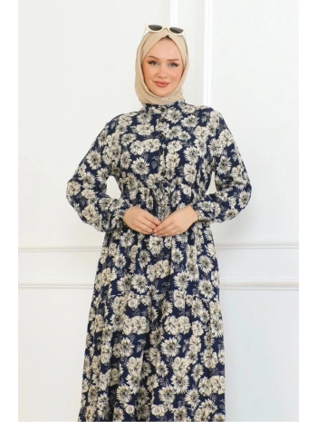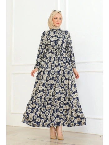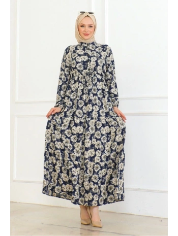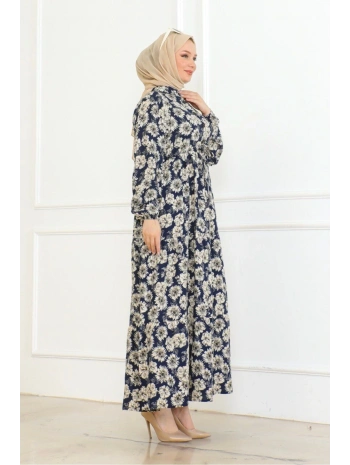 Düğme Detaylı Çiçekli Viskon Elbise - Lacivert