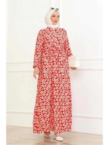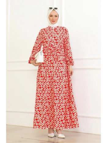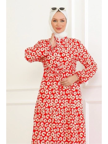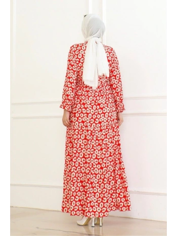 Çiçek Desenli Önü Bağlamalı Elbise / Kırmızı