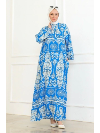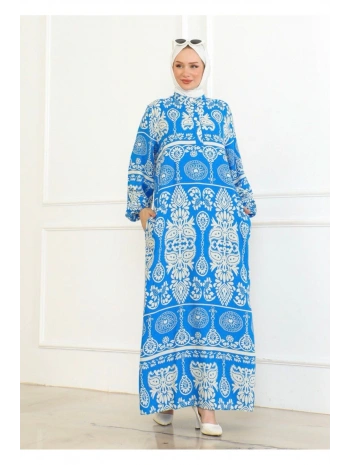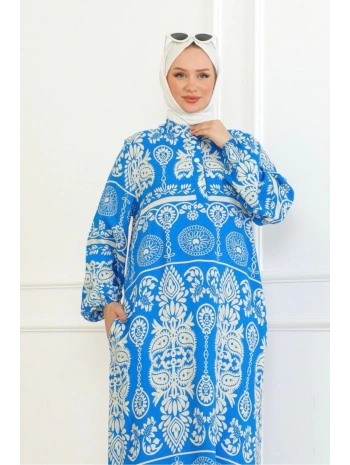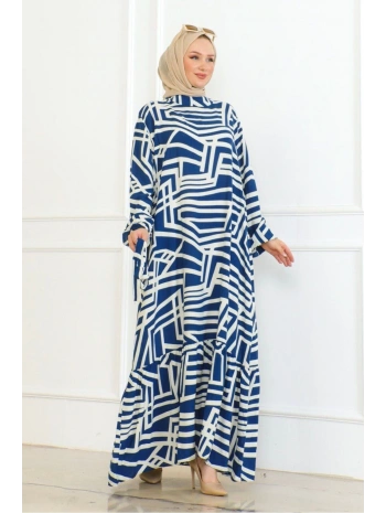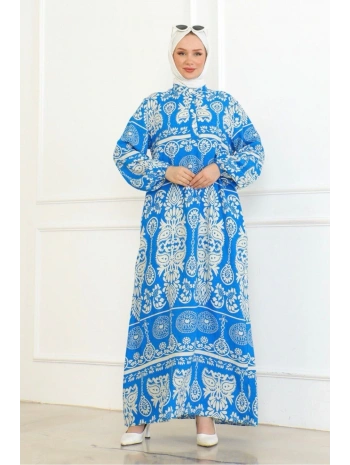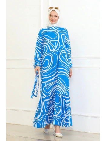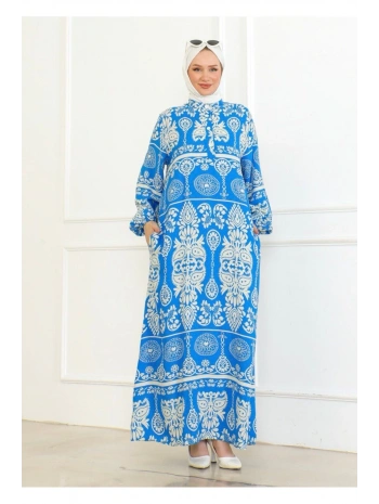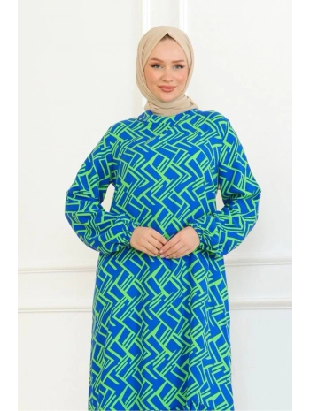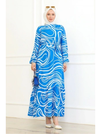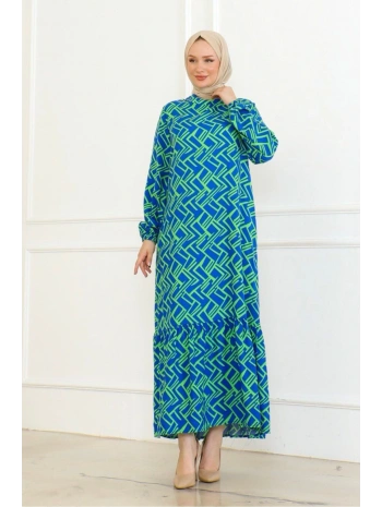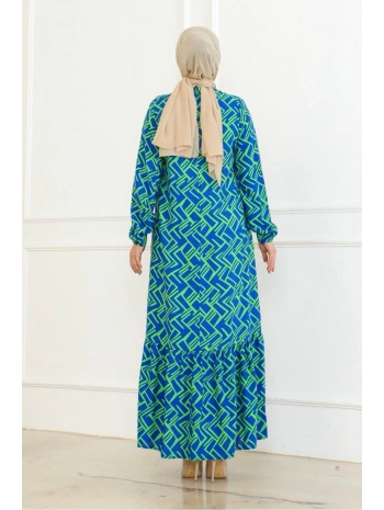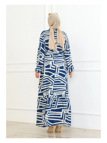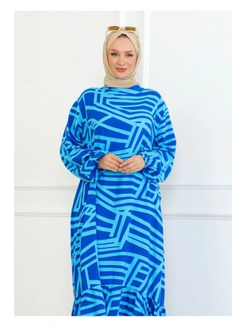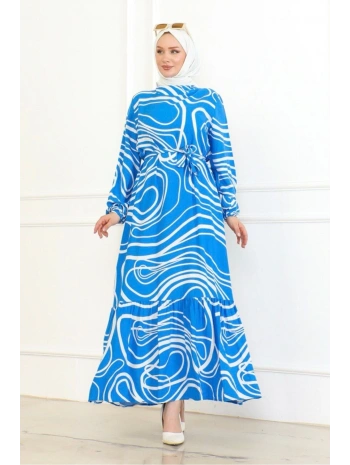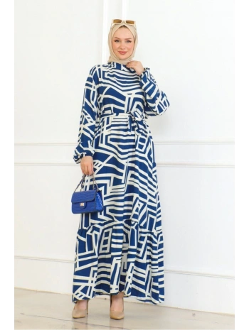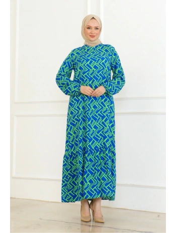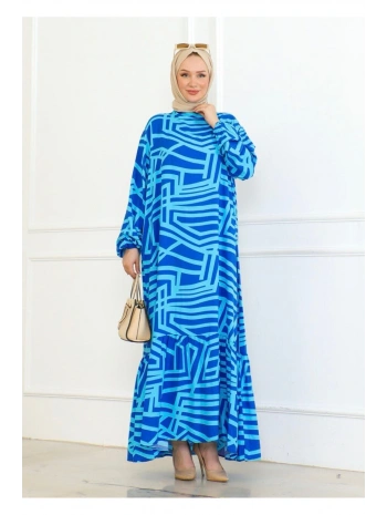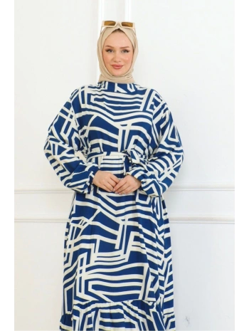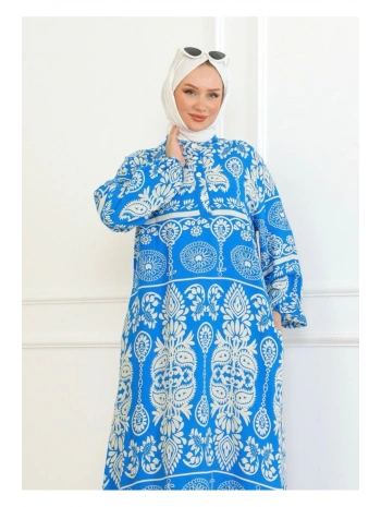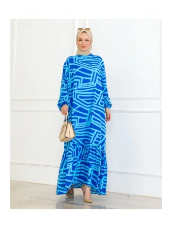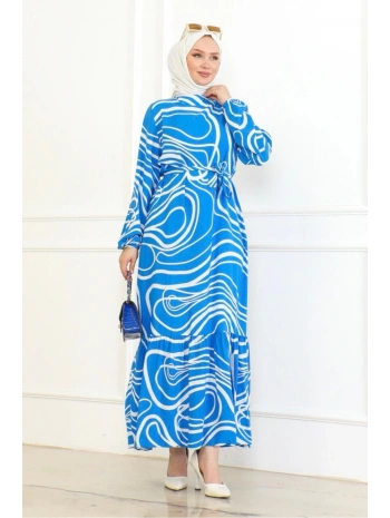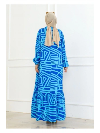 Desenli Viskon Elbise - Mavi