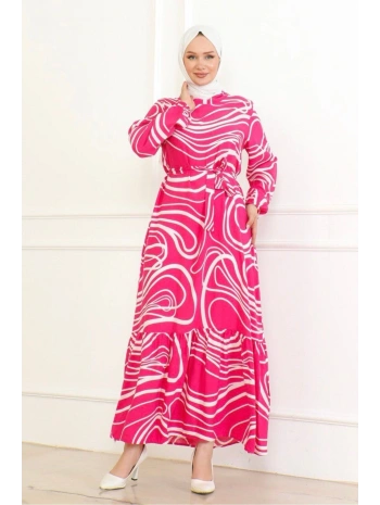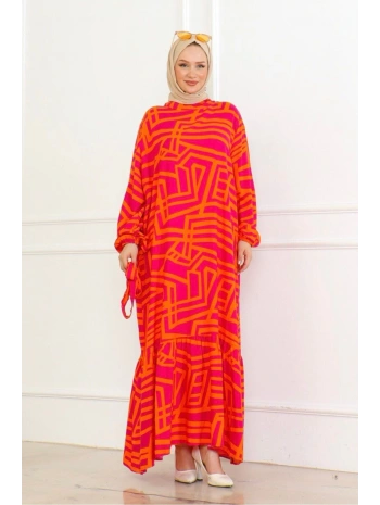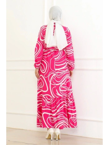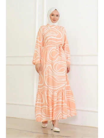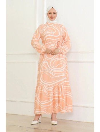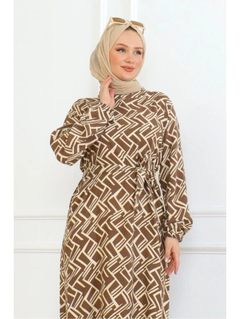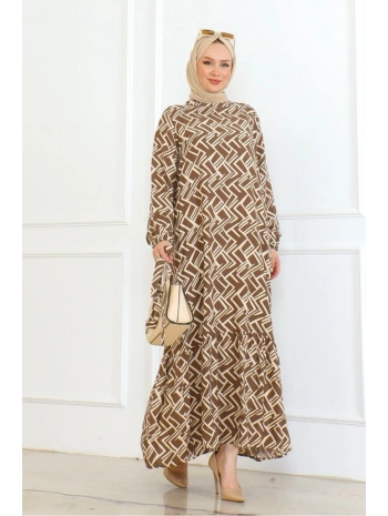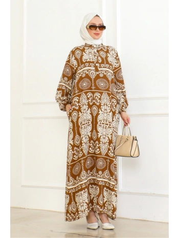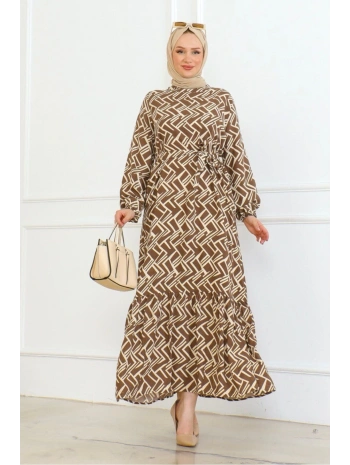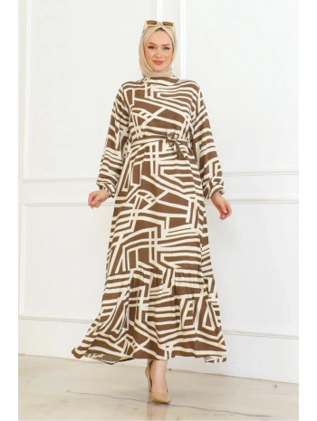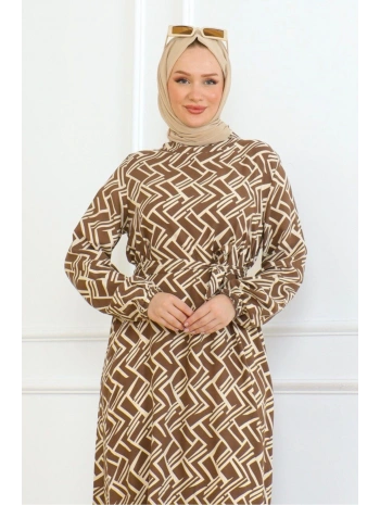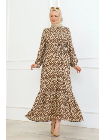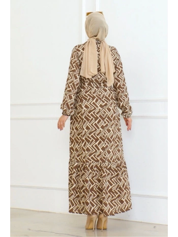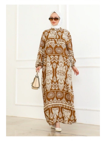 Desenli Viskon Elbise - Taba