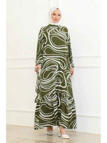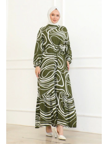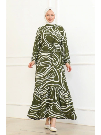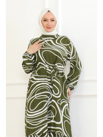 Çizgi Desenli Viskon Elbise - Haki