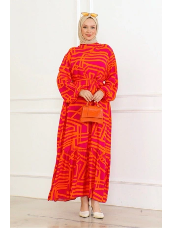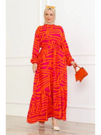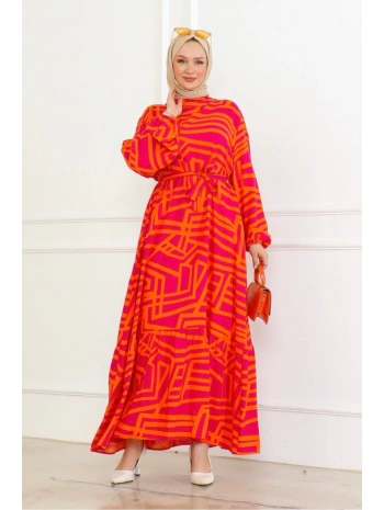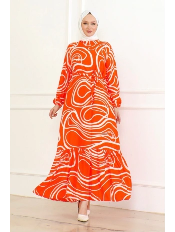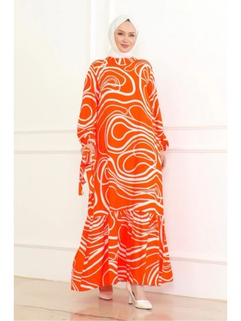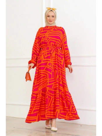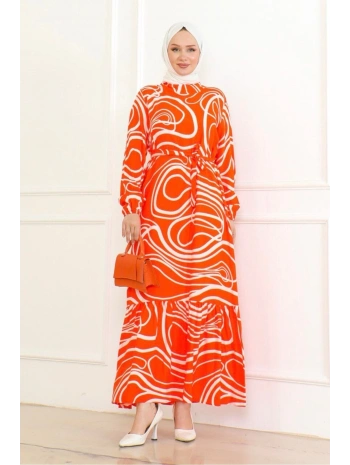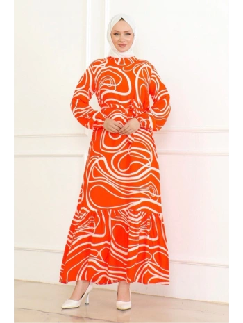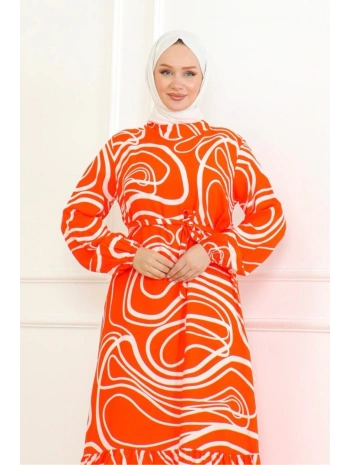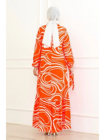 Çizgi Desenli Viskon Elbise - Turuncu