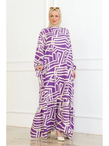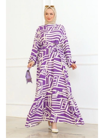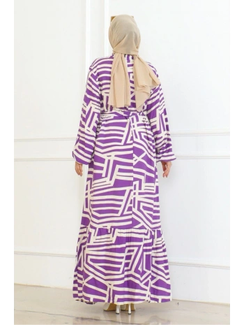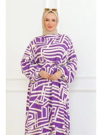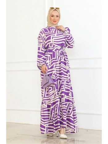 Viskon Çizgi Desenli Elbise - Mor