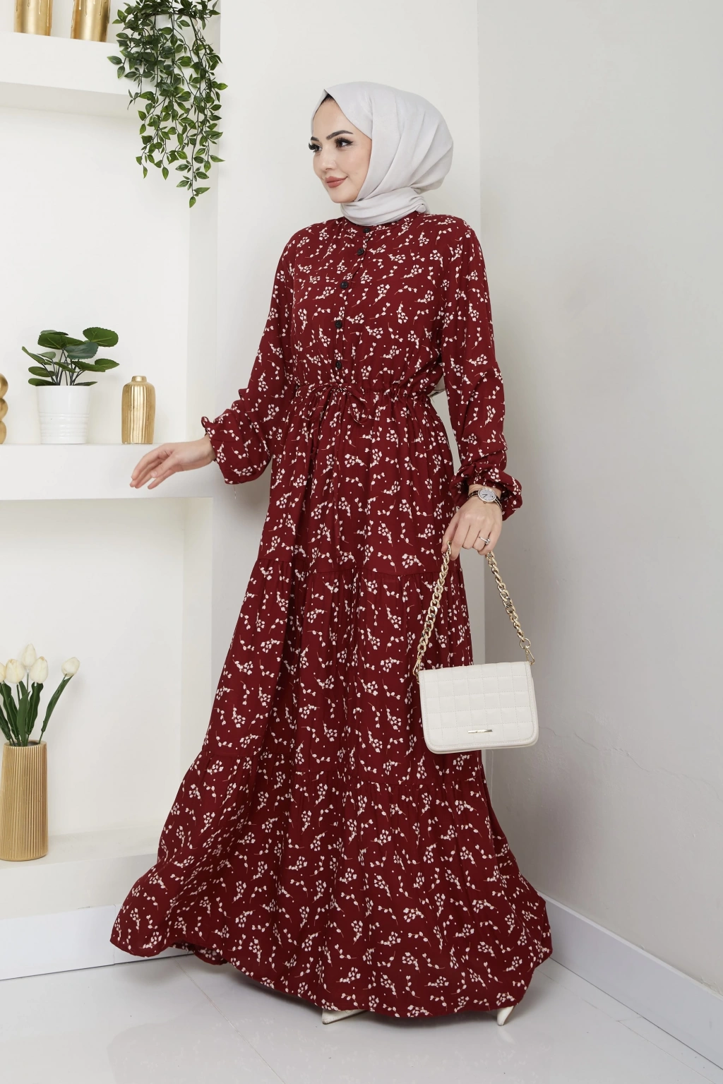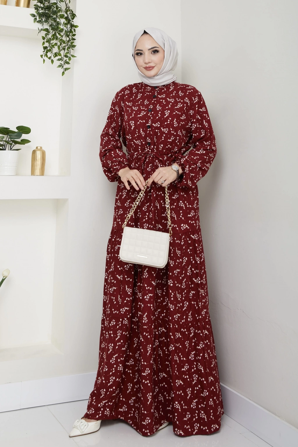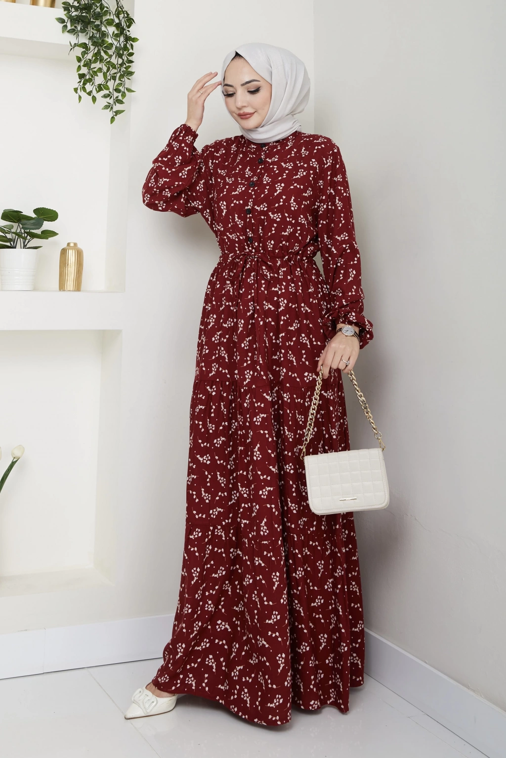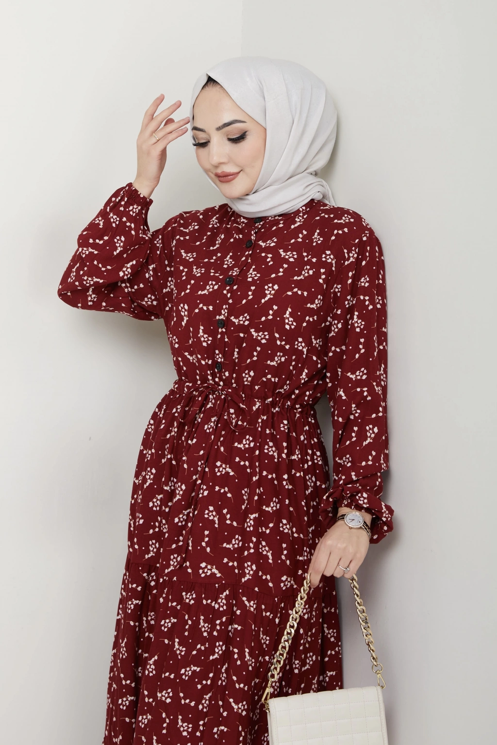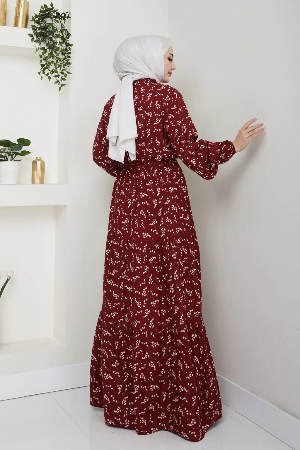 Yaprak Desenli Bağlamalı Viskon Elbise - Bordo / E0125